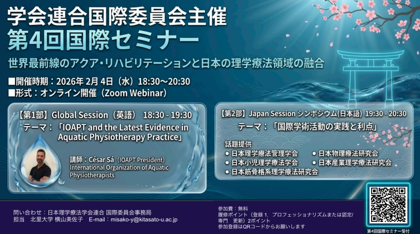 本セミナーでは、World Physiotherapy のスペシャリティグループの一つである The International Organisation of Aquatic Physiotherapists(IOAPT)に焦点を当て、国際的な水中運動療法の最新動向とその実践について学ぶ機会を提供いたします。