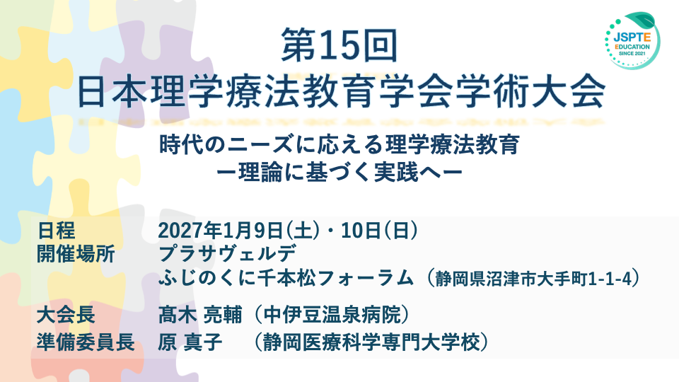 第15回日本理学療法教育学会学術大会は,2027年1月9日(土)・10日(日)の2日間にわたってプラサヴェルデ ふじのくに千本松フォーラム(静岡県沼津市)にて開催いたします。大会テーマは,「時代のニーズに応える理学療法教育~理論に基づく実践へ~」です。
