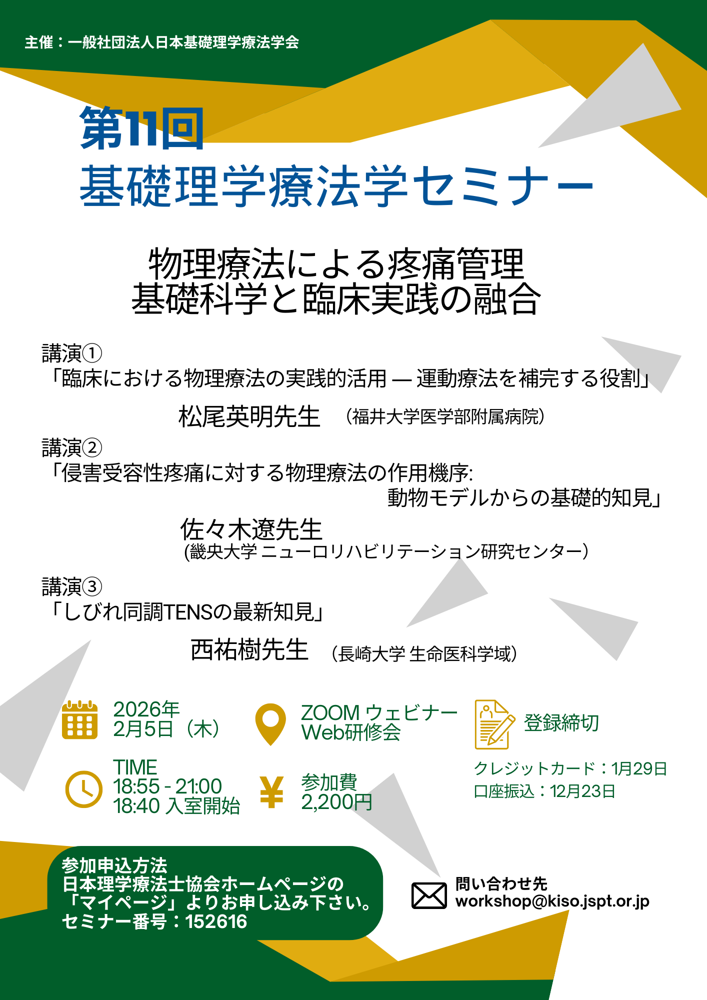 疼痛は臨床現場における最大の課題のひとつであり、その管理には科学的根拠に基づいた多角的なアプローチが求められている。近年、物理療法の作用機序について基礎研究レベルでの理解が進み、臨床応用に直結する知見が蓄積されつつある。また、新たな治療技術の開発も進展し、患者一人ひとりに適した介入を検討するための科学的基盤が整いつつある。本セミナーでは、臨床における物理療法の実践的活用、とくに運動療法を補完し治療効果を高める役割に着目する。さらに、基礎科学から明らかにされてきたメカニズムや最新治療技術の展開を整理し、臨床実践と基礎研究を橋渡ししつつ、疼痛管理における物理療法の未来を展望する。
