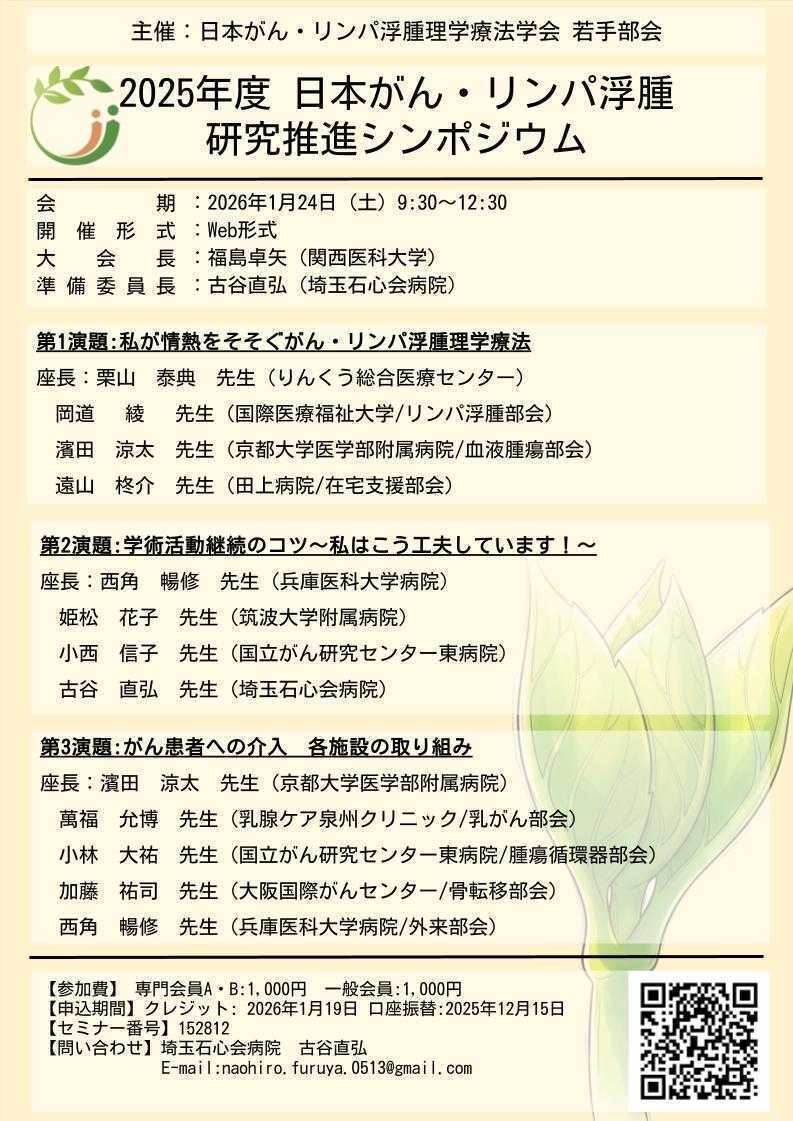 | 参加申込み | セミナー番号:152812 参加費:1,000円 申込み期限(クレジットカード支払い):2026年1月19(月) PT協会マイページよりお申込みください。 https://mypage.japanpt.or.jp/mypage/login |