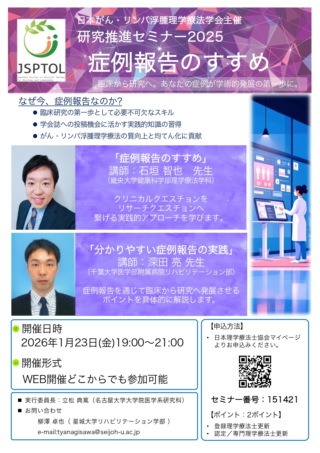 | 参加申込み | 日本理学療法士協会のホームページ内「マイページ」よりお手続きください。 日本理学療法士協会マイページURL:https://mypage.japanpt.or.jp/mypage/login セミナー番号:151421 申込締切:2026年1月19日(*クレジットカード支払い期限:2026年1月18日) 参加費:2,000円 生涯学習ポイント: 2.0ポイント(登録理学療法士更新または認定/専門理学療法士更新) |