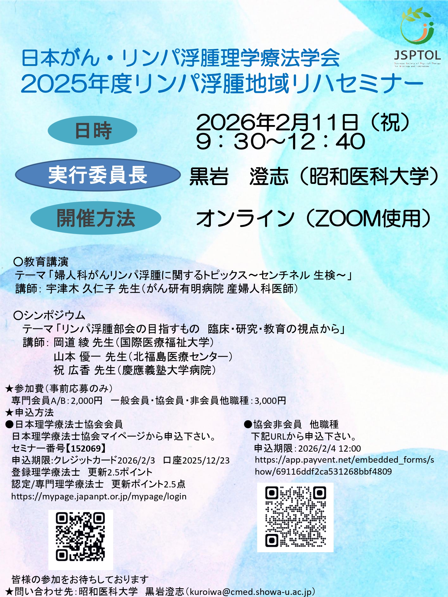| 参加申込み | ・日本理学療法士協会会員 日本理学療法士協会マイページ(https://mypage.japanpt.or.jp/mypage/login)からお申込下さい。 セミナー番号【152069】 申込期限:クレジットカード2026/2/3 口座2025/12/23 登録理学療法士 更新2.5ポイント 認定/専門理学療法士 更新ポイント2.5点 ・協会非会員 他職種 下記URLからお申込下さい。 https://app.payvent.net/embedded_forms/show/69116ddf2ca531268bbf4809 申込期限:2026/2/4 12:00 ・参加費(事前応募のみ):専門会員A/B:2,000円 一般会員・協会員・非会員他職種:3,000円 |